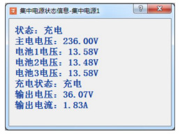 雙擊集中電源設(shè)備,則會(huì)出現(xiàn)集中電源的狀態(tài)一欄,該欄中顯示此集中電源的工作狀態(tài),主、備電源電壓值。要查看具體信息時(shí),請(qǐng)雙擊狀態(tài)信息欄,可查看詳細(xì)工作信息,包括當(dāng)前輸出電壓值和輸出電流值。