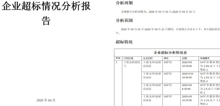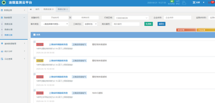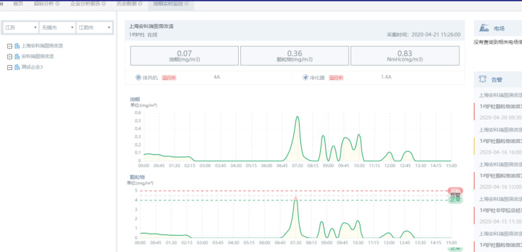 系統(tǒng)根據(jù)采集的油煙數(shù)值大小,產(chǎn)生對(duì)應(yīng)的排放超標(biāo)告警;對(duì)凈化器的運(yùn)行數(shù)據(jù)分析,上傳凈化設(shè)備對(duì)應(yīng)的運(yùn)行、停機(jī)、故障等告警事件。