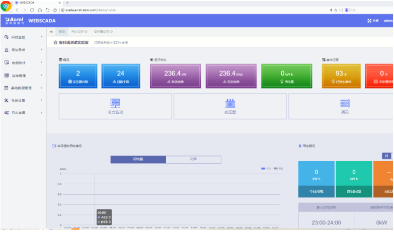 展示頁面顯示變電站數量、變壓器數量、監測點位數量等概況信息,設備通信狀態,用電分析和事件記錄。首頁顯示場站的變壓器數量、回路個數、有功功率、無功功率、用電量、事件記錄等概況信息,可通過實時監控、變壓器、通信、視頻切換到需要查看的界面。