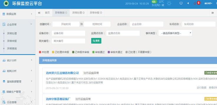通過關聯分析、超限分析、啟停時間分析,及時發現環保治理設備未開啟、異常關閉及減速、空轉、降頻等異常情況,同時通過數據分析還可以實時監控限產和停產整治企業運行狀態,如圖所示: