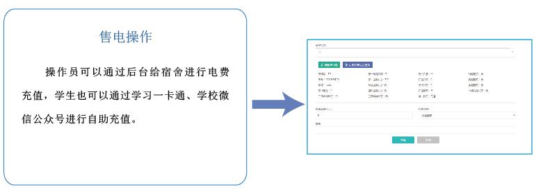 高校宿舍預付費電控系統(tǒng)集電能計量、收費管理、用電過程管理等功能于一體,具備遠程實時抄表計量、控制學生作息、惡性負載識別預警、校園一卡通自助繳費、微信查詢、打印用能報表等功能,創(chuàng)建節(jié)約校園、安全校園,方便校方進行信息化管理,并支持和智慧校園系統(tǒng)的數(shù)據(jù)對接。