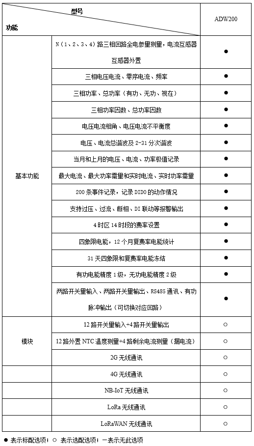 ADW2xx系列導軌式多回路電力儀表主要用于低壓三相回路全電參量測量,同時可選擇四個回路的電流輸入。可直接或間接測量電壓、電流、功率、功率因數、相角、不平衡度、諧波等參數。 還可通過其RJ45接口擴展輔助功能,實現DI、DO、測溫、剩余電流測量,以及2G、4G、LoRa、LoRaWan、NB-Lot無線通信功能。